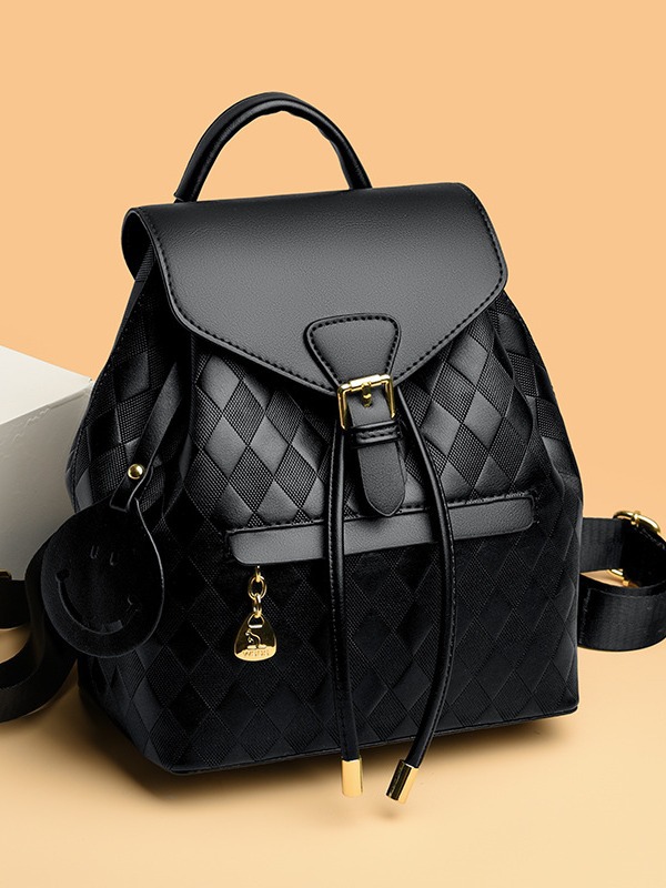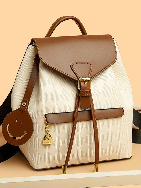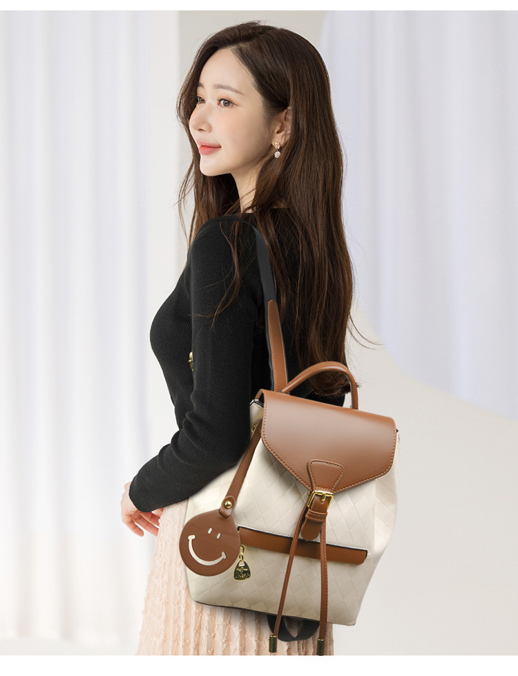 上質な革バッグレディースとして仕上げた、フラップ式の洗練されたリュックです。 本体は上品な質感の素材を使用し、蓋部分と持ち手には本革を贅沢に配しました。 フロントのベルト金具がクラシカルな雰囲気を演出し、可愛らしい笑顔モチーフのチャームがアクセントになっています。 デイリー使いから通勤まで幅広く活躍する、機能性とデザイン性を兼ね備えた逸品です。